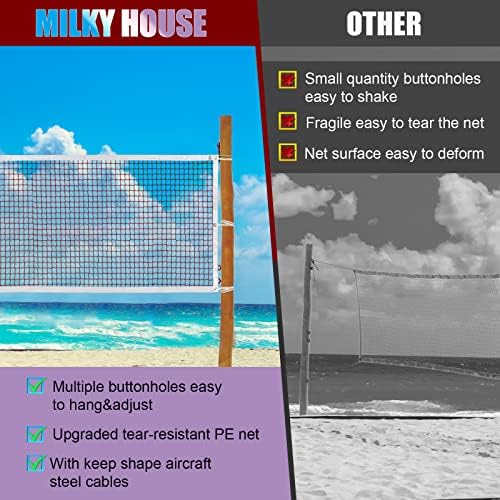 🏸 Milky House knotless badminton net is made of high-quality polyester and nylon fabric. Portable badminton net, official beach badminton volleyball net.