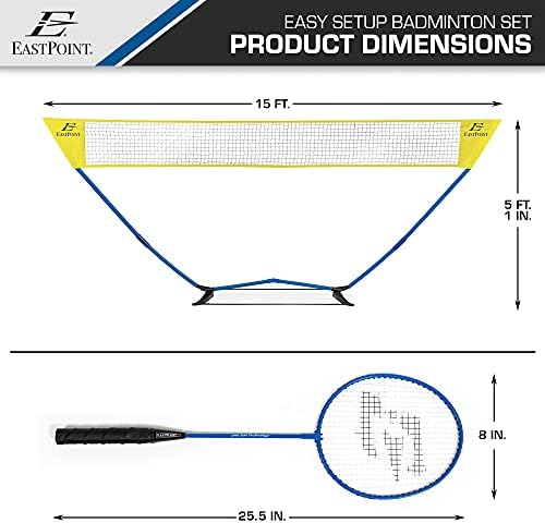 Make every day game day with the Easy Setup Badminton Set from EastPoint Sports. This complete backyard set includes everything you need to start playing your favorite lawn game: net and poles, durable base, badminton rackets, shuttlecocks and guide ropes. Maximize your playing time with the easy setup net and pole system. Follow the instructions to build the base, snap in the poles and slide on the 15’ net. No tools required. Host a backyard party with friends or enjoy a weekend at home with the kids. Children and adults of a variety of ages will enjoy hours of fun as they try to keep the birdies from hitting the ground. The included steel rackets feature comfortable hand grips and are built to last for season of play. Entertaining a large group? EastPoint Sports offers additional sets of badminton rackets for the ultimate team action. When the games end, the net is easy to takedown and store with all accessories in the included carry bag. The compact storage system provides easy transportation from the backyard to the beach and everywhere in between. EastPoint Sports offers a full line of indoor and outdoor games and accessories to keep you entertained all year around. Start playing today!