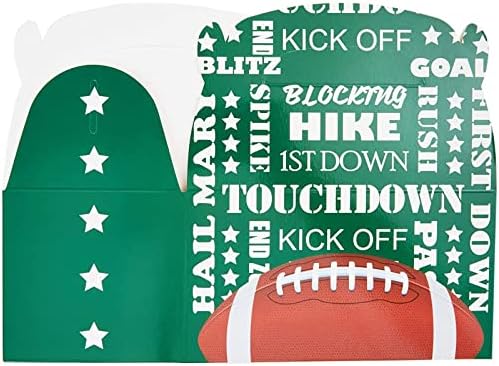 SPORTS PARTY DECORATIONS: Complete your sports party decor with these green football party favor boxes with fun football sayings such as “Touchdown, Kick Off, and Hail Mary”; hand them out to guests as they arrive, or place on the dining tables