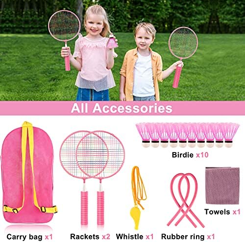 【16 in 1 Badminton Set】This kids badminton set contains basic tools required for badminton, 2 x badminton rackets, 10 x badminton birdie, 1 x whistle, 1 x towels, 2 x rubber ring, 1 x carrying bag that can be carried on the shoulders. It is a high-quality gift for children’s birthday, Christmas and Thanksgiving. It is also an ideal choice for badminton training.
