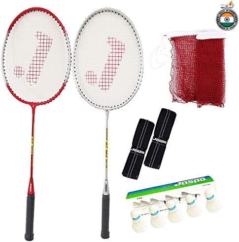 Jaspo GT 303 Pro Red/Sliver Badminton Set(2 Badminton Racket and 5 Feather Shuttle Cork,1 Carry Bag,1 Grip,1 Badminton net)