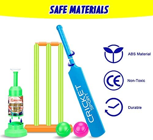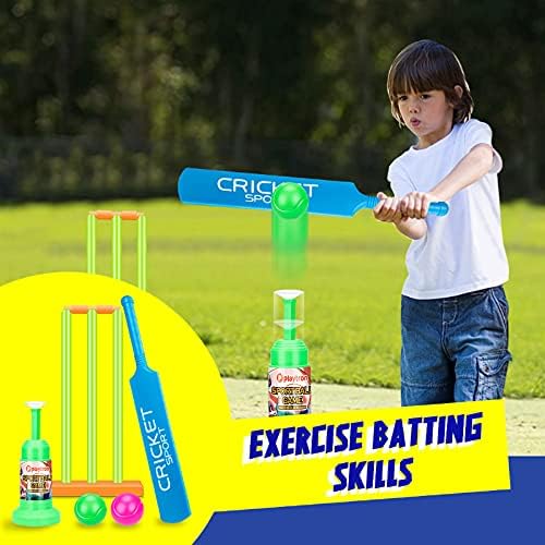 【SAFE MATERIALS】Our Cricket Play Set are made of premium ABS material, safe and durable, long service time. The ball is light so your kids can play it without worry about getting hurting or anything getting damaged. Just press the launcher and put down a ball, the ball will jump up automatically, then you can hit it easily! It is a funny baseball pitching machine for kids, practicing their batting skills.For the younger kid, put ball in the launcher and hit the ball directly.
