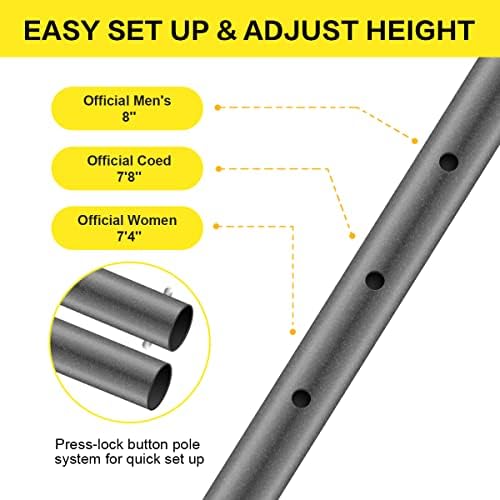 ★Adjustable Height: 8 x powder-coated steel poles measured 1.5’’ in diameter are strong enough to offer maximum stability. Easy to choose a volleyball nets outdoor height with the push-button locking system. 3 height options: men’s(8”), co-ed (7’8”) and women’s (7’4”) playing heights.