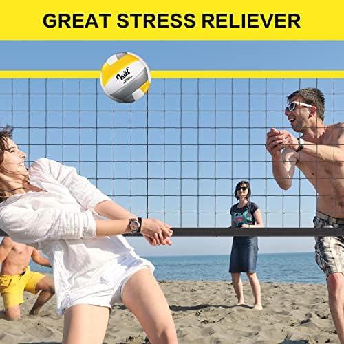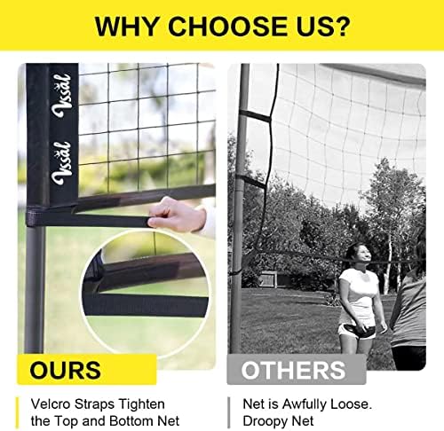 ★No Base Needed + Velcro Straps Tighten the Net: Get rid of base, with steel stakes, set official volleyball set to the lawn, backyard or beach. The volleyball set is equipped with velcro straps to easily adjust the tension of the net to keep the top and bottom net remains taut and straight. No more droopy net. No mechanical failure.
