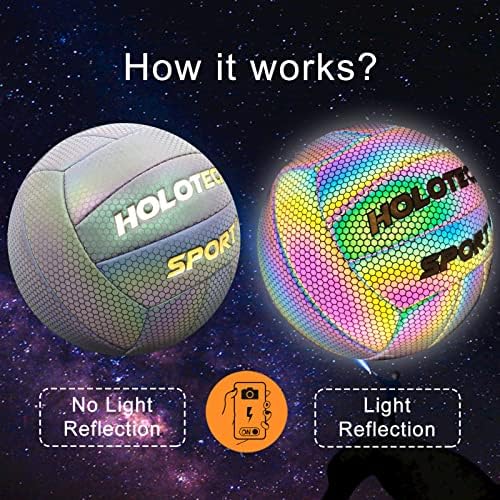 This holographic volleyball is made of premium reflective PU leather, when light hits this volleyball, it reflects off light and causes a spectacular holographic glowing effect. The perfect holographic glowing volleyball effect is to take photos or videos with the flash on.